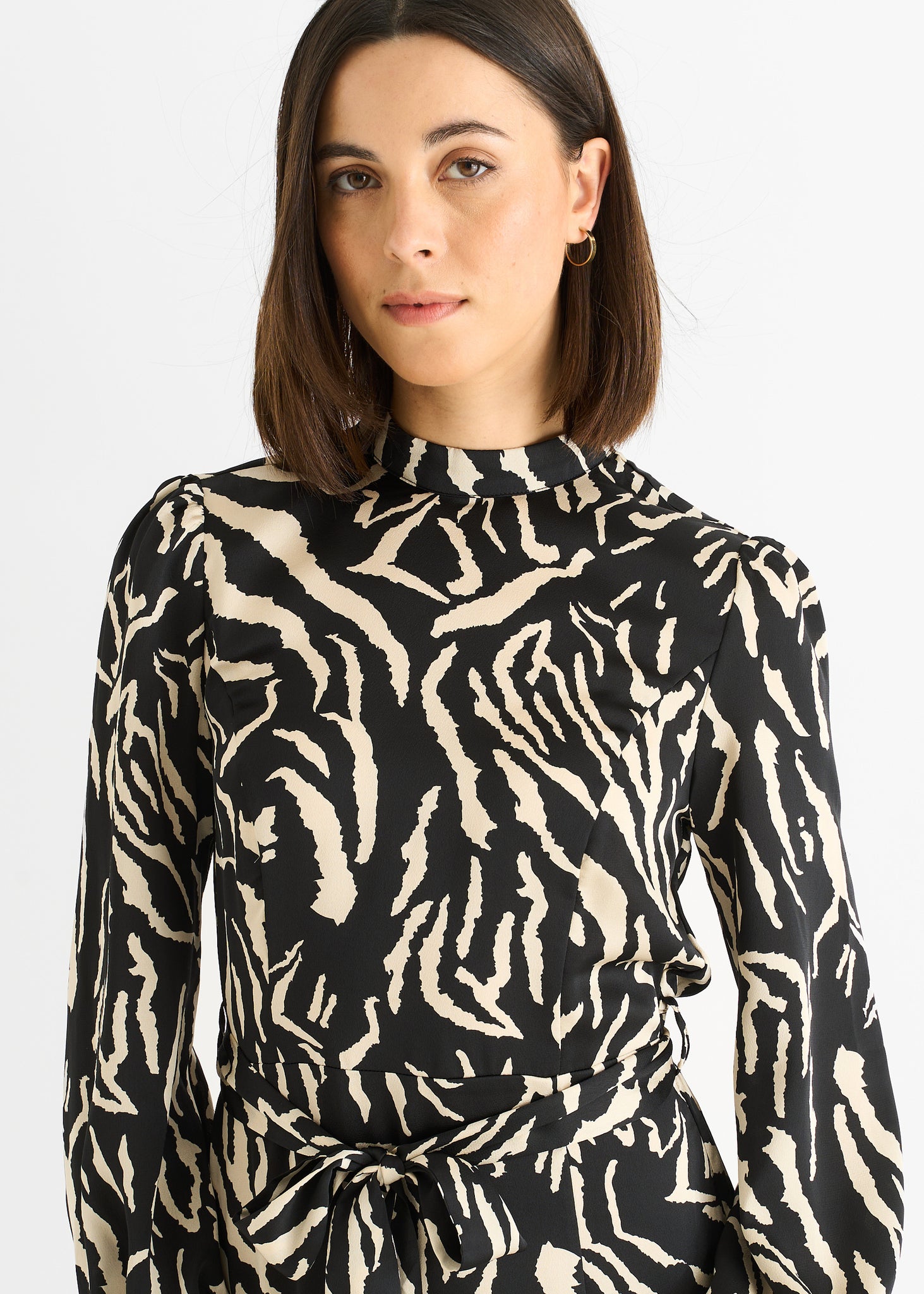 Elevate your wardrobe with this Black Animal High Neck Satin Midi Dress. Crafted from smooth satin, it offers a comfortable fit with a bold animal print that stands out effortlessly. The high neck design adds a touch of sophistication, while the midi length keeps it versatile for day or night wear. Perfect for those who want to combine casual ease with striking style.