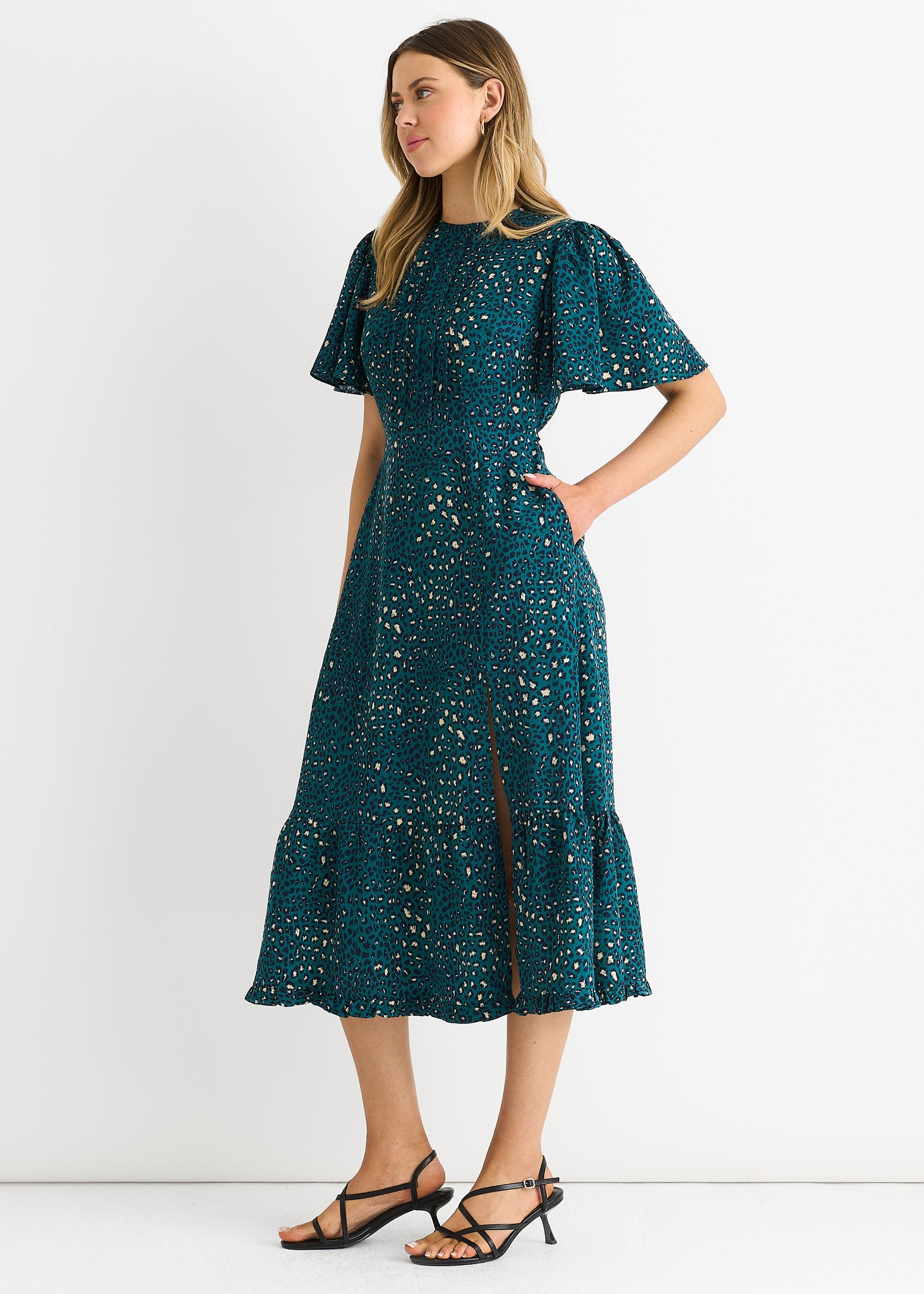 Embrace effortless style with this Green Animal Print Smock Tiered Midi Dress. Its loose, tiered design offers all-day comfort while making a bold statement with a vibrant animal print. Perfect for casual and formal occasions, this dress combines a relaxed fit and eye-catching pattern to keep you comfortable and confident wherever you go.