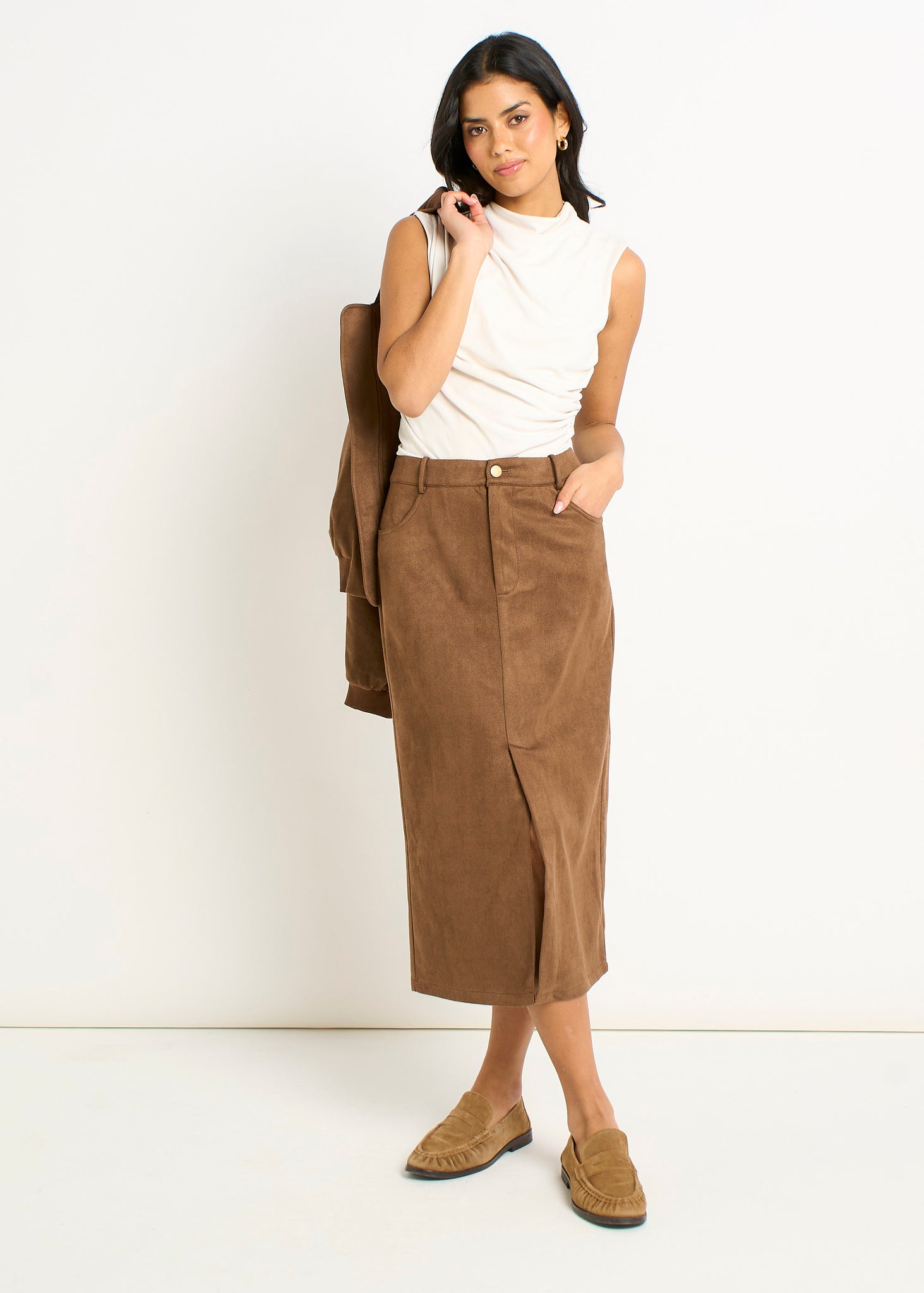 Timeless sophistication wrapped in buttery faux suede, this pencil skirt hugs your curves in all the right ways, delivering that polished silhouette that works from office to dinner. The rich brown tone pairs seamlessly with everything in your wardrobe—crisp whites, bold jewel tones, neutral knits. Luxuriously soft to the touch, it's the kind of piece that feels indulgent yet effortlessly wearable. Dress it up with a silk blouse and heels, or keep it casual with a fitted tee and trainers. A closet staple that never goes out of style.
