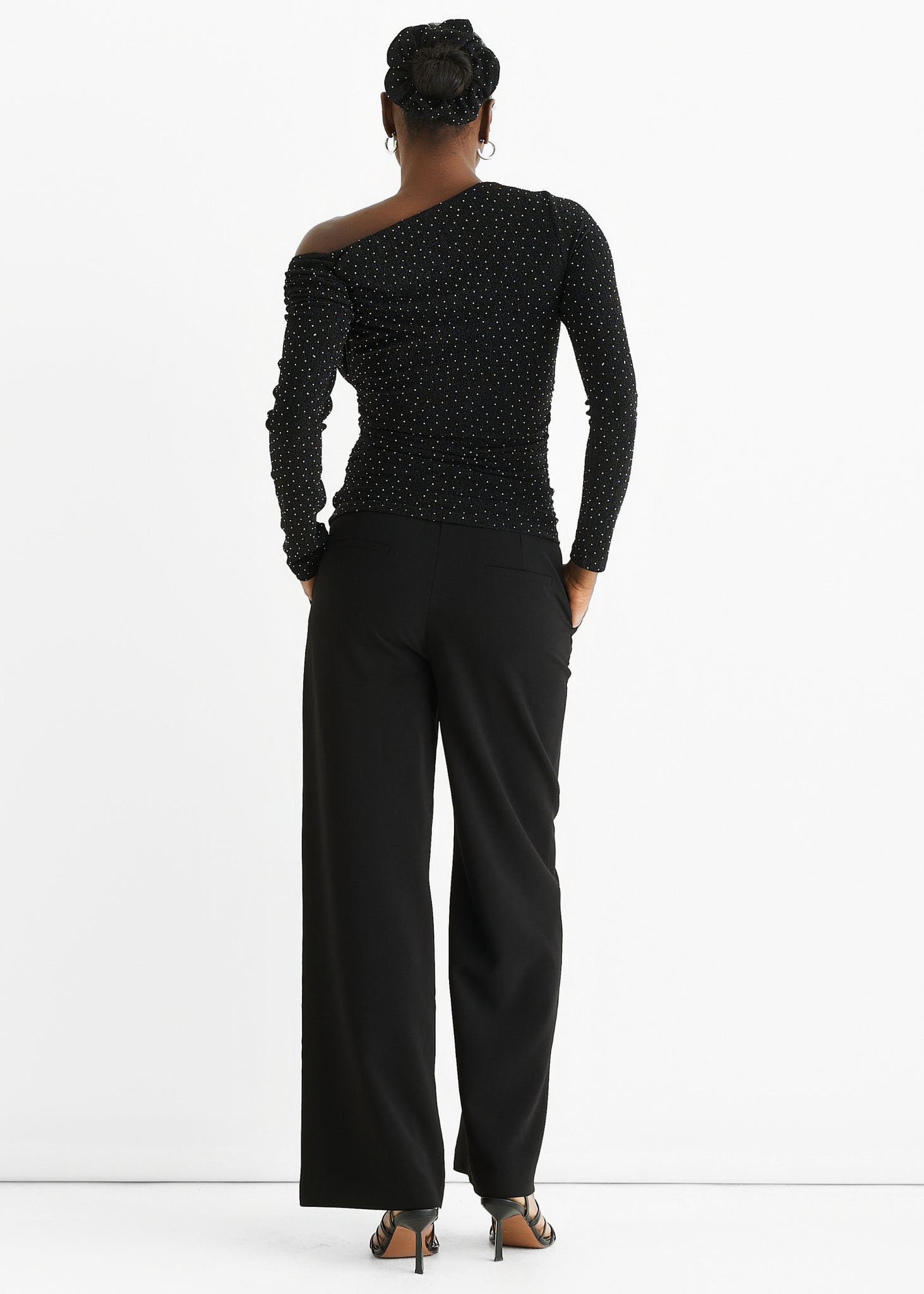 The Black Diamante Slash Neck Top offers a perfect blend of casual comfort and bold style. Its unique slash neckline is highlighted with sparkling diamante details, adding a touch of glamour to your everyday outfit. Crafted for a relaxed fit, this top ensures all-day ease while helping you stand out with confidence.