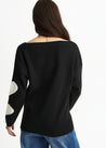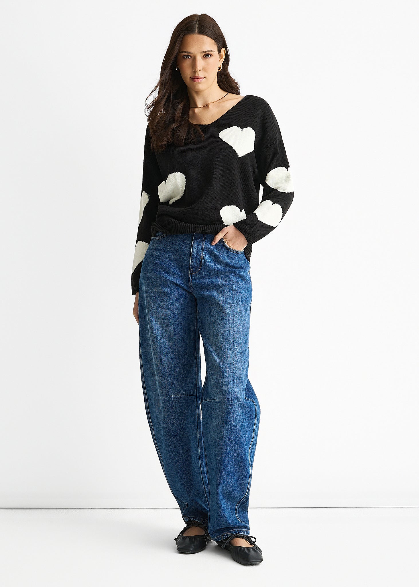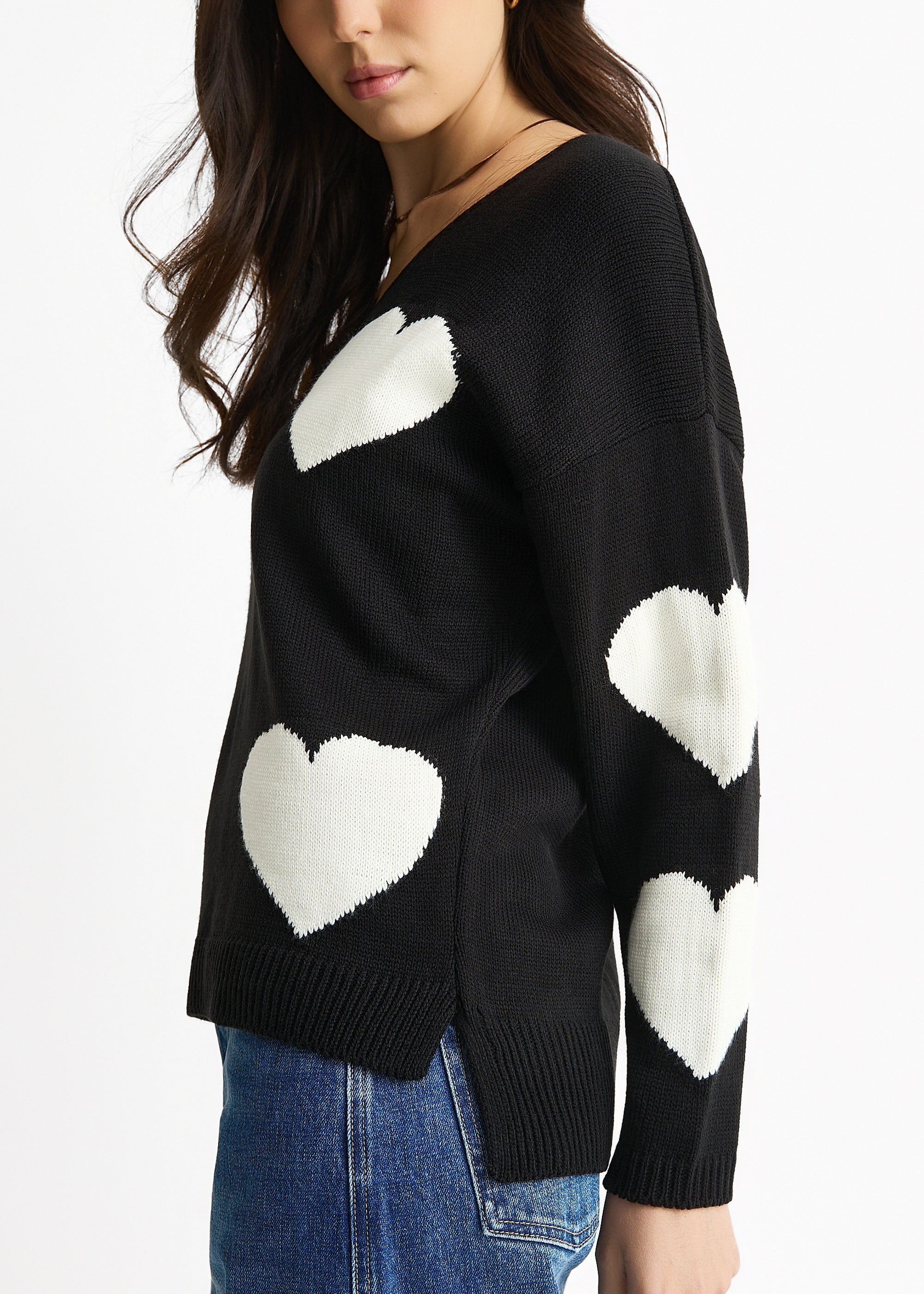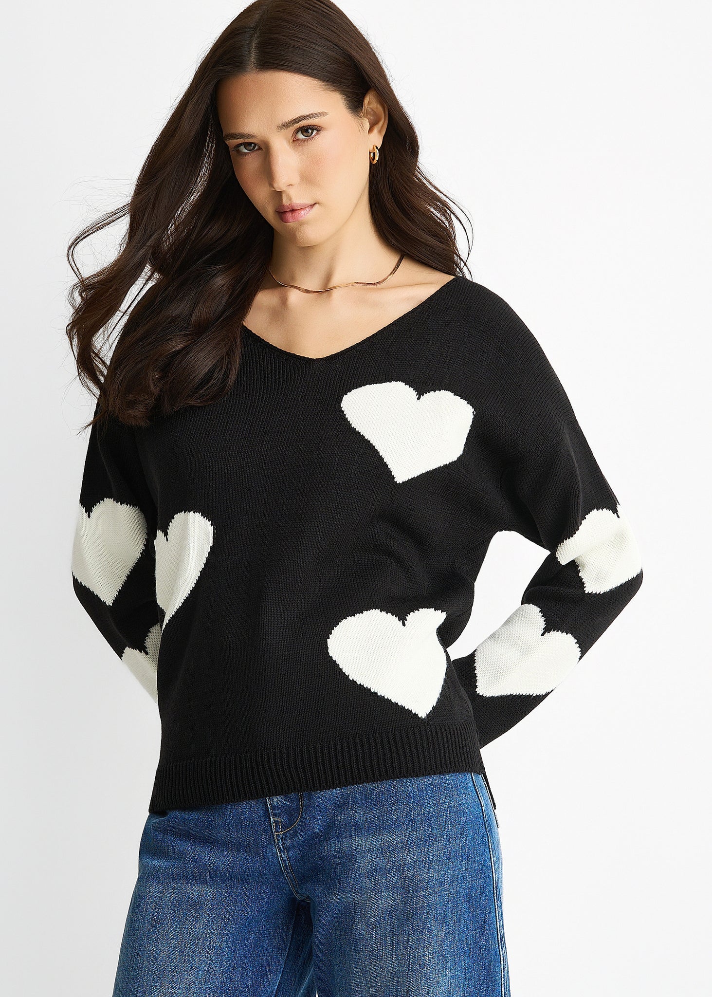 Stay cozy and stylish with our Black V Neck Oversized Heart Knit Jumper. The v-neck design flatters any figure while the oversized heart graphic adds a touch of playful charm. Perfect for chilly days and nights, this jumper is a must-have in any fashion-forward wardrobe.