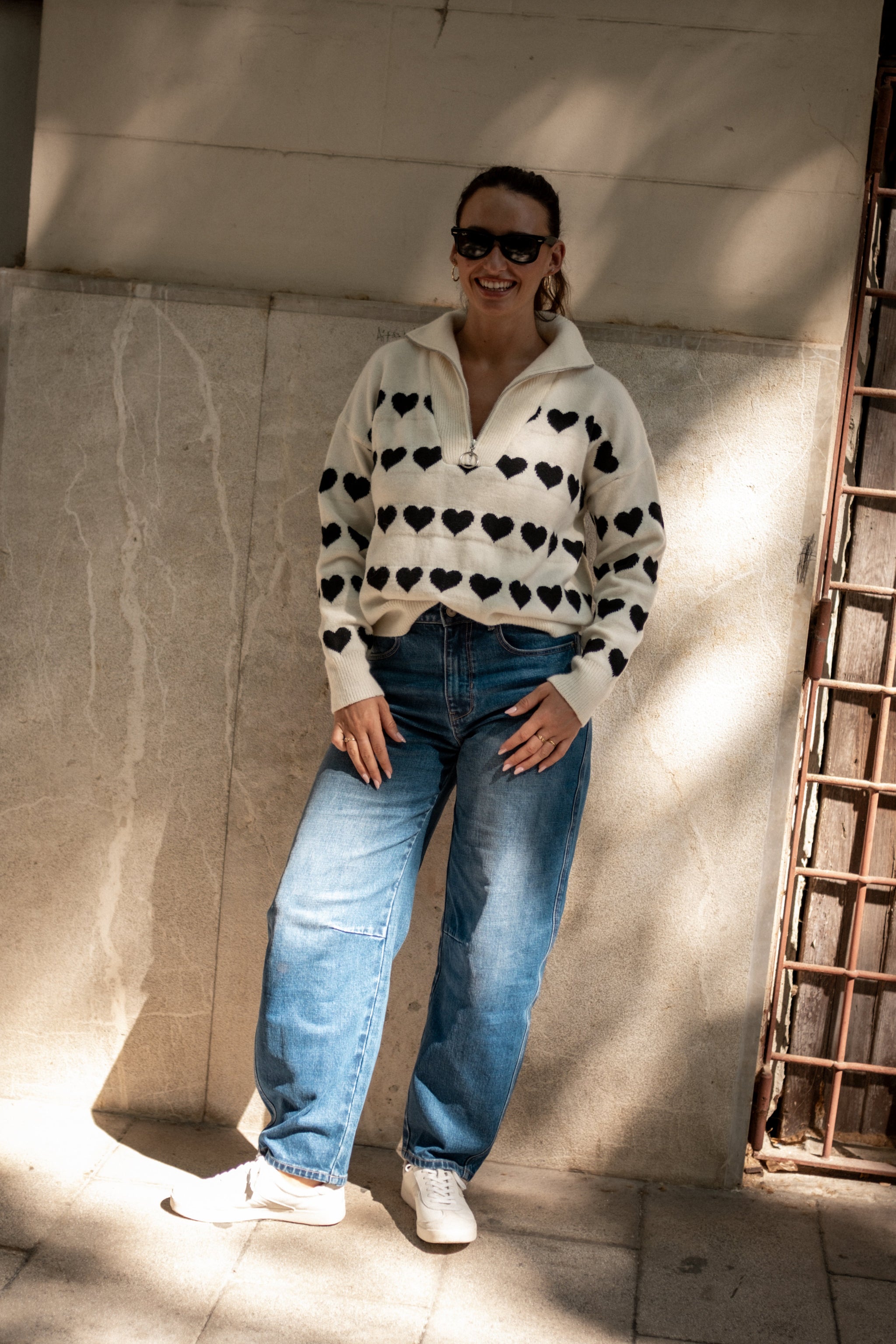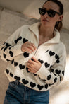 Cream Heart Zip Up Loose Fit Knit Jumper
