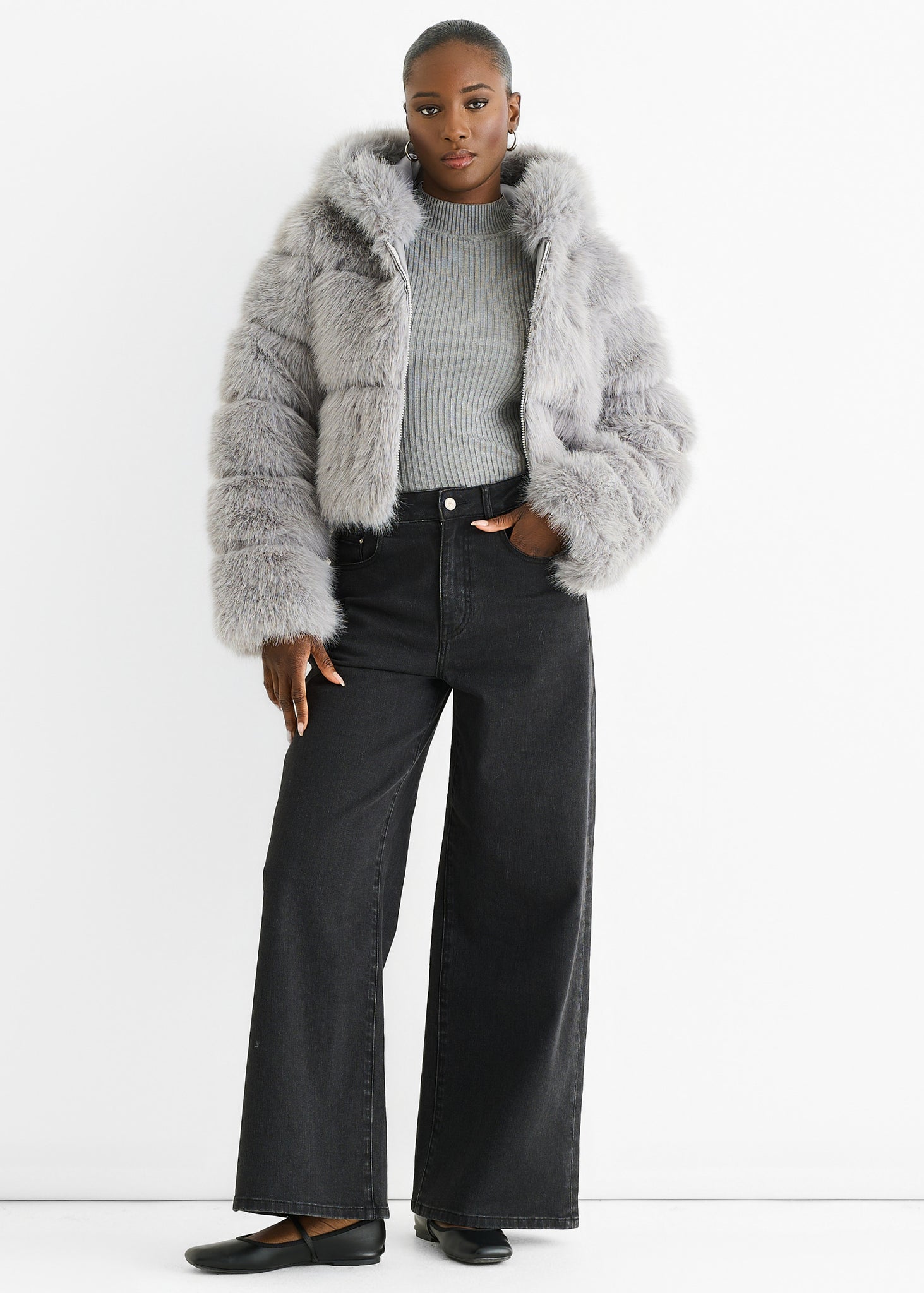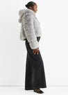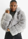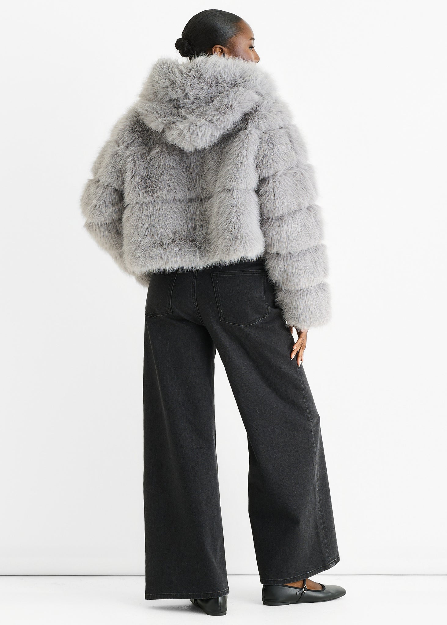 Light Grey Panel Faux Fur Zip Front Hooded Jacket