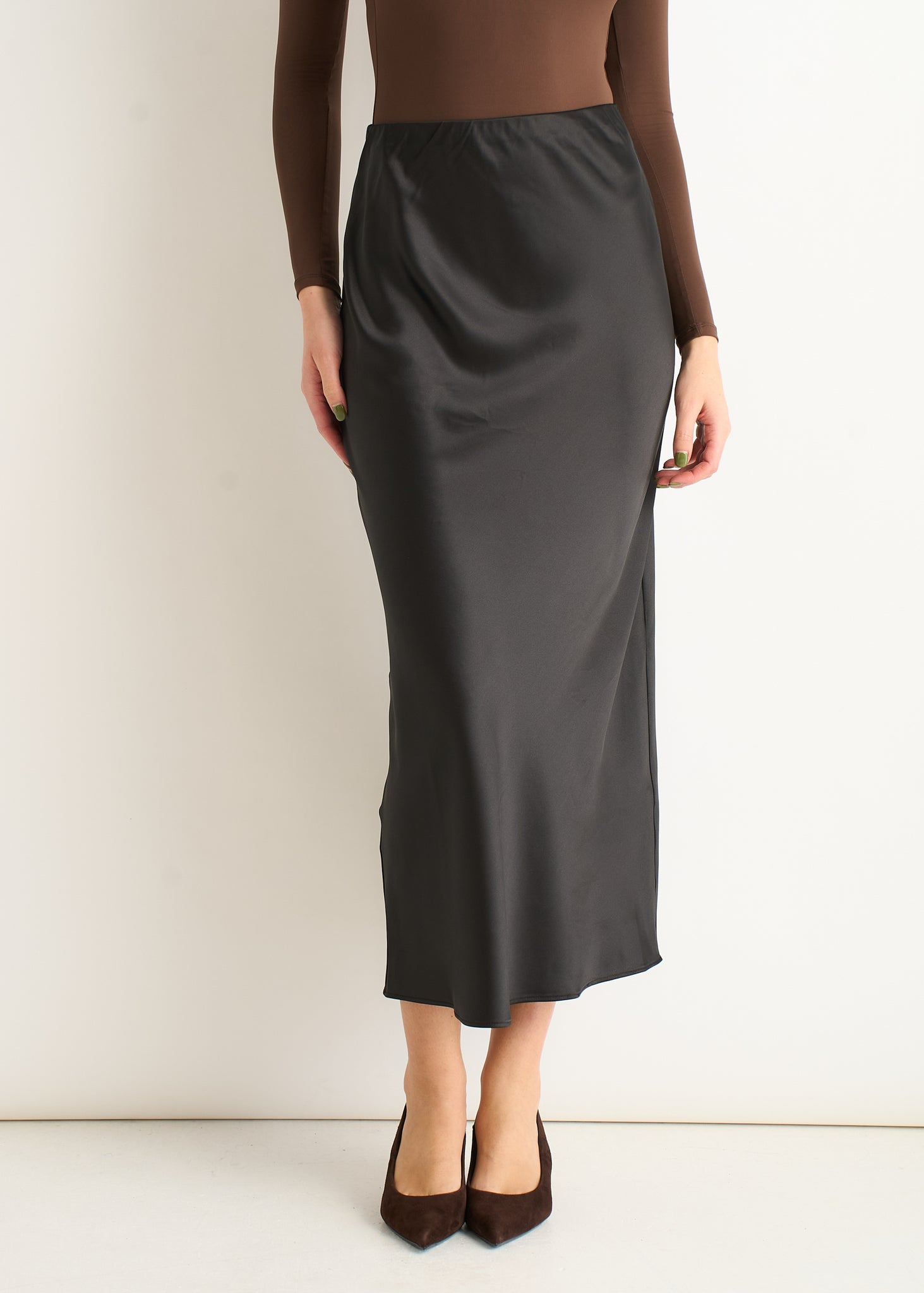 Black Satin Bias Cut Midi Skirt