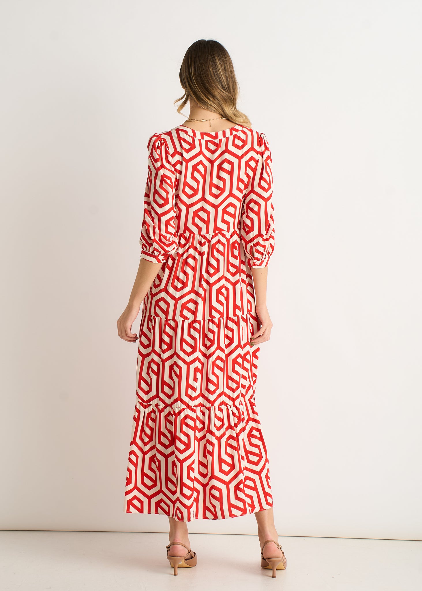 - Red and white maxi smock dress featuring a geometric print, 2/3-length sleeves and tiered layers for a relaxed, flowing silhouette.