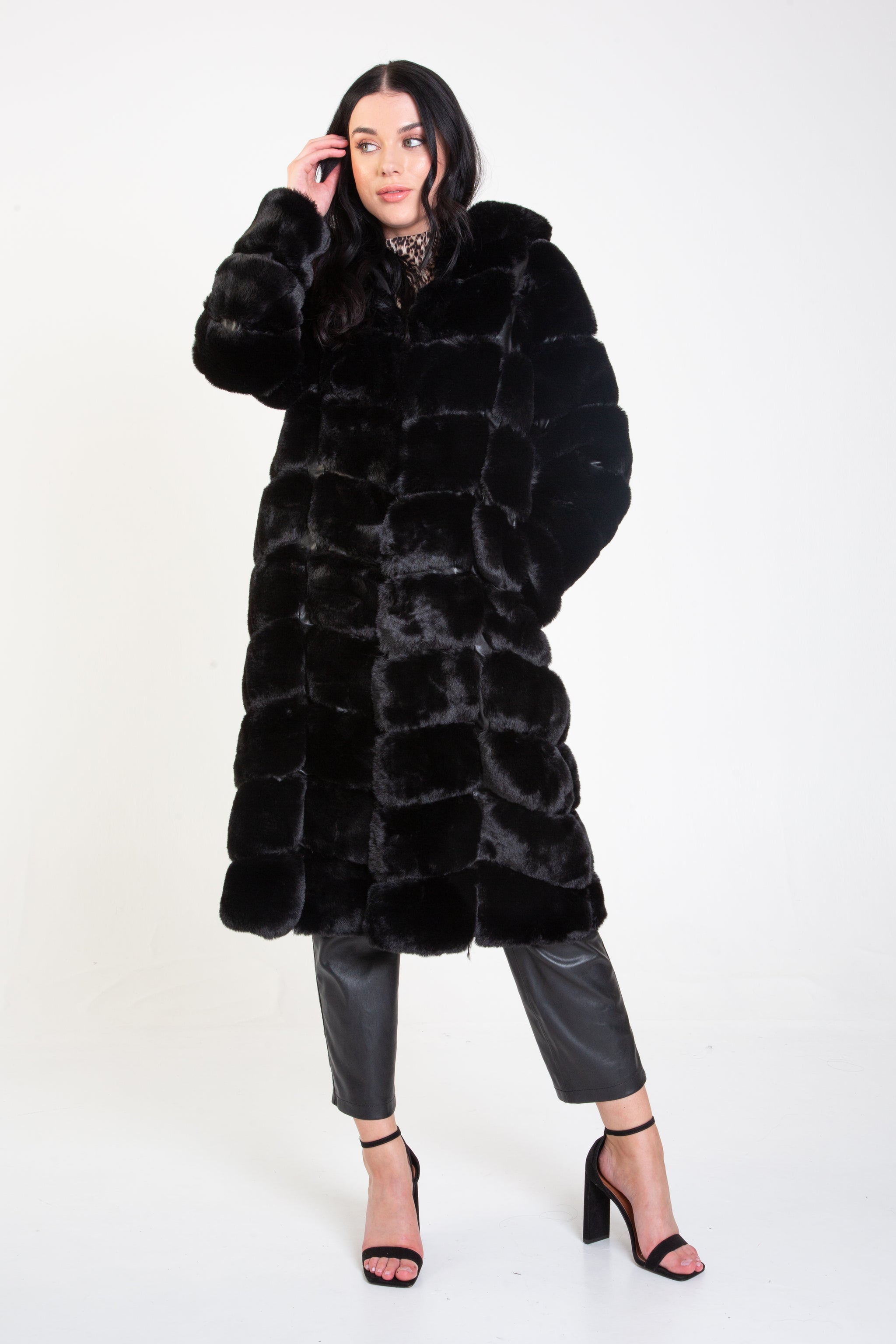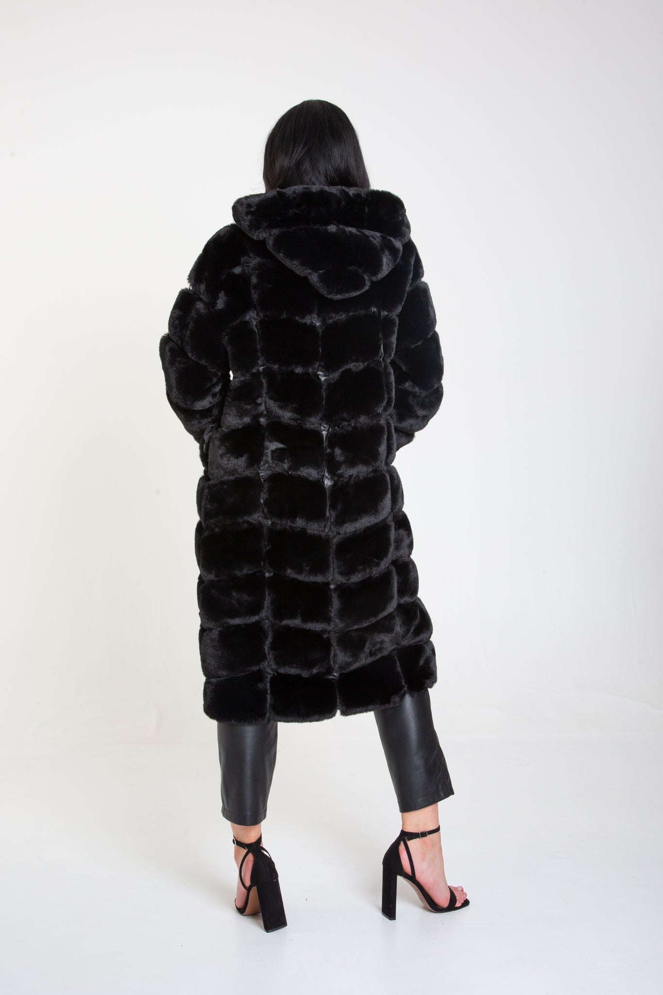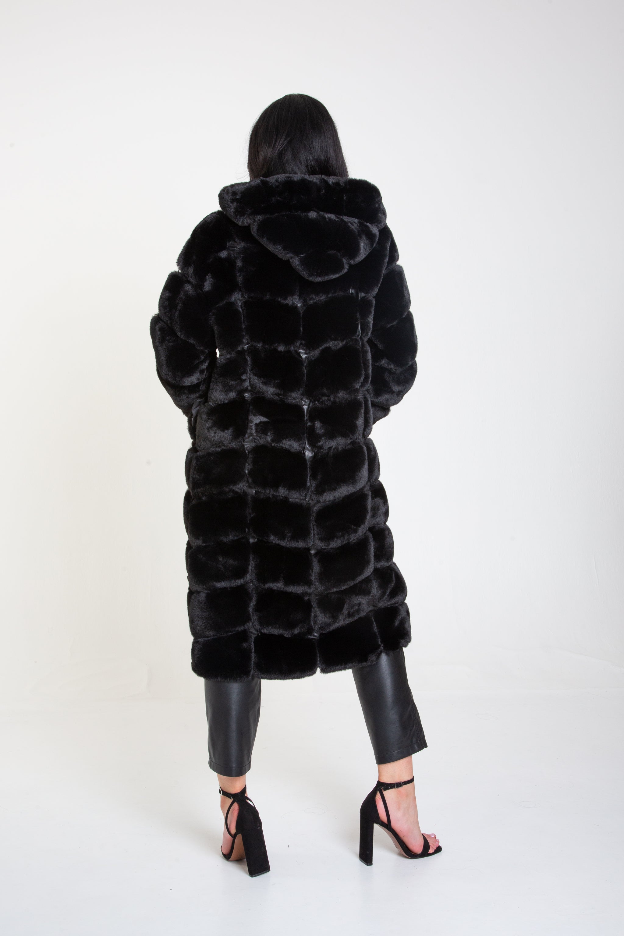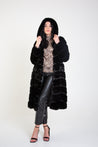 Black Panelled Hooded Longline Fur Coat