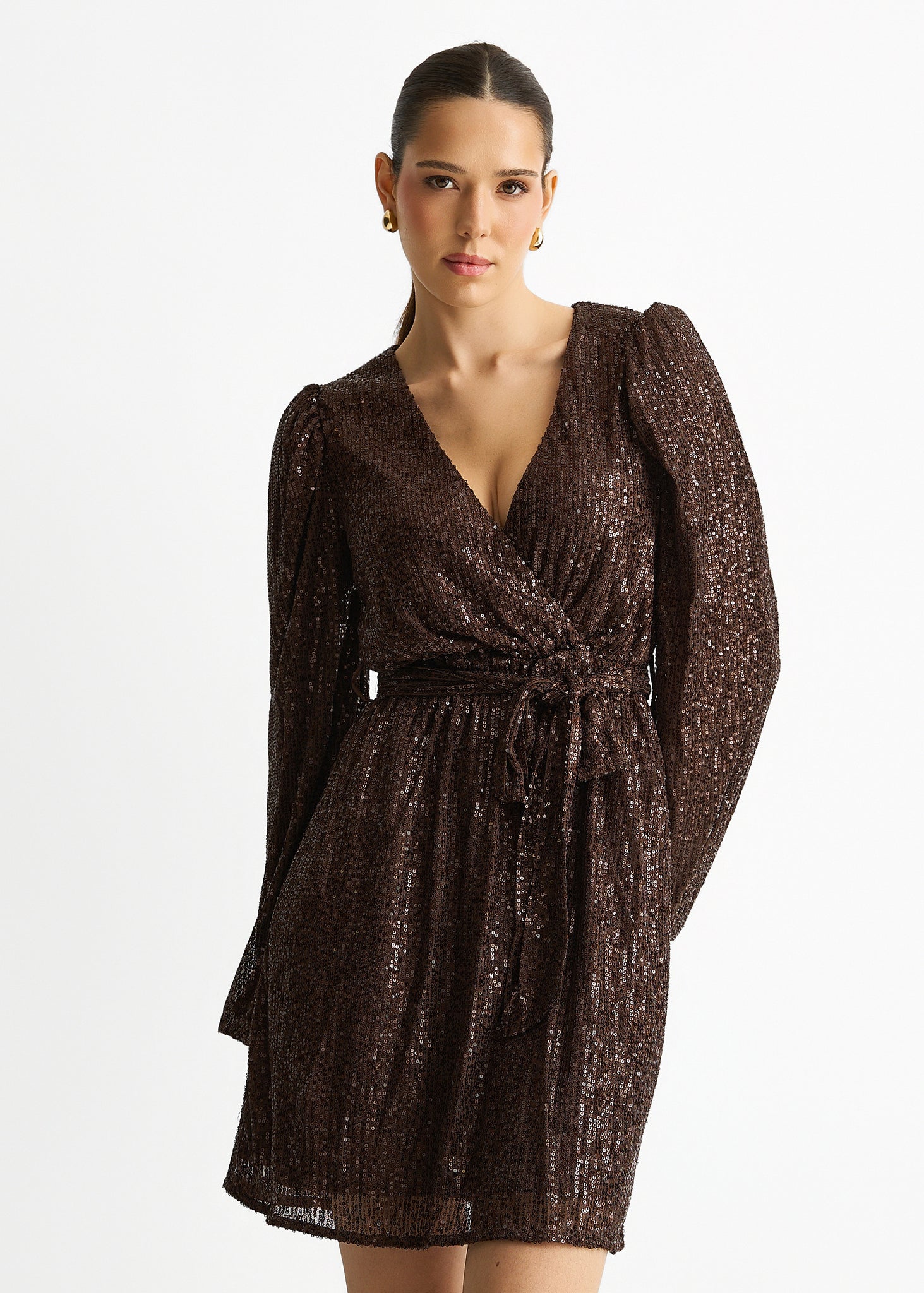 This Chocolate Sequin V Neck Belted Mini Dress combines bold sparkle with casual comfort. Its flattering V-neck and adjustable belt create a confident silhouette, while the mini length adds a playful touch.