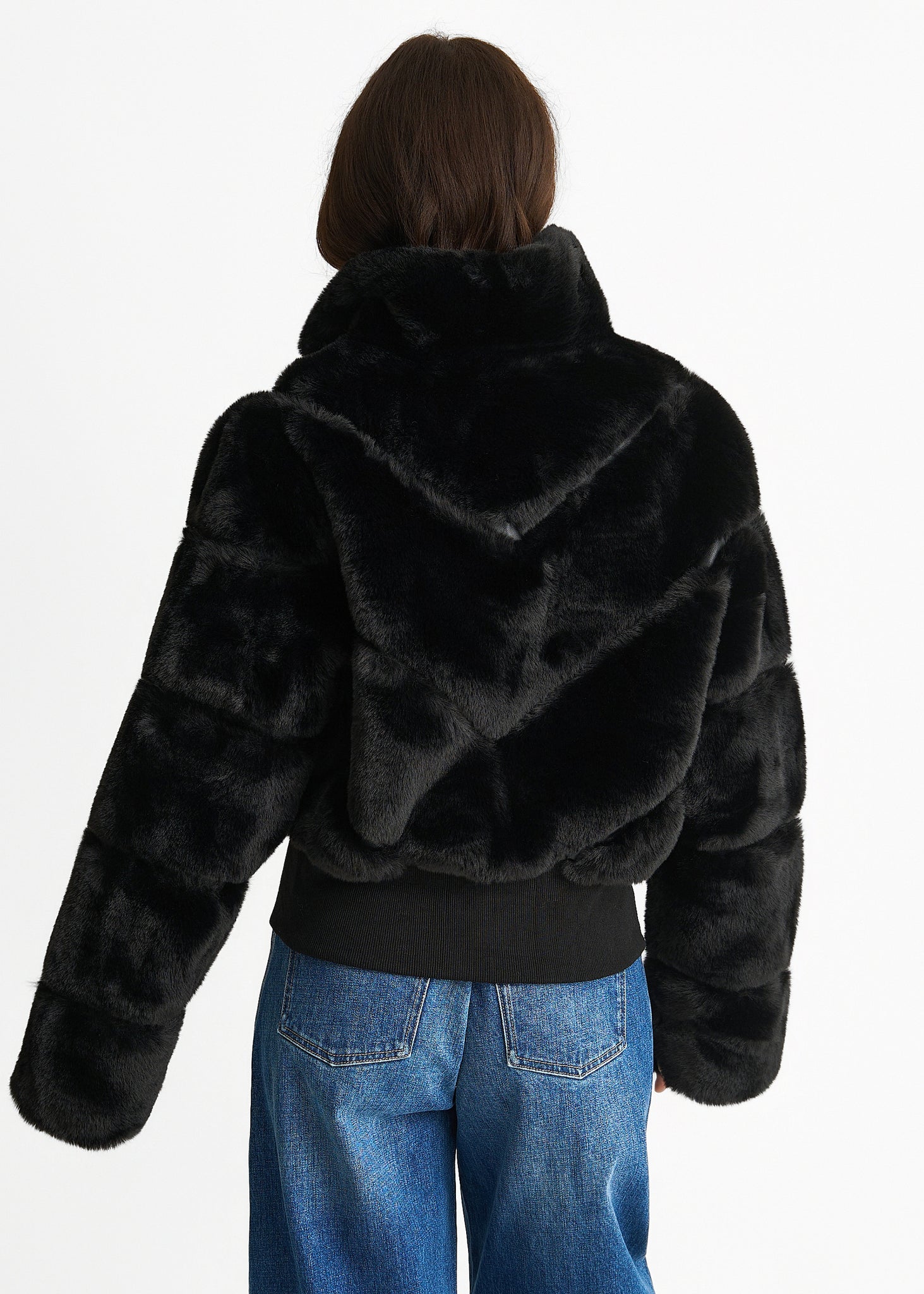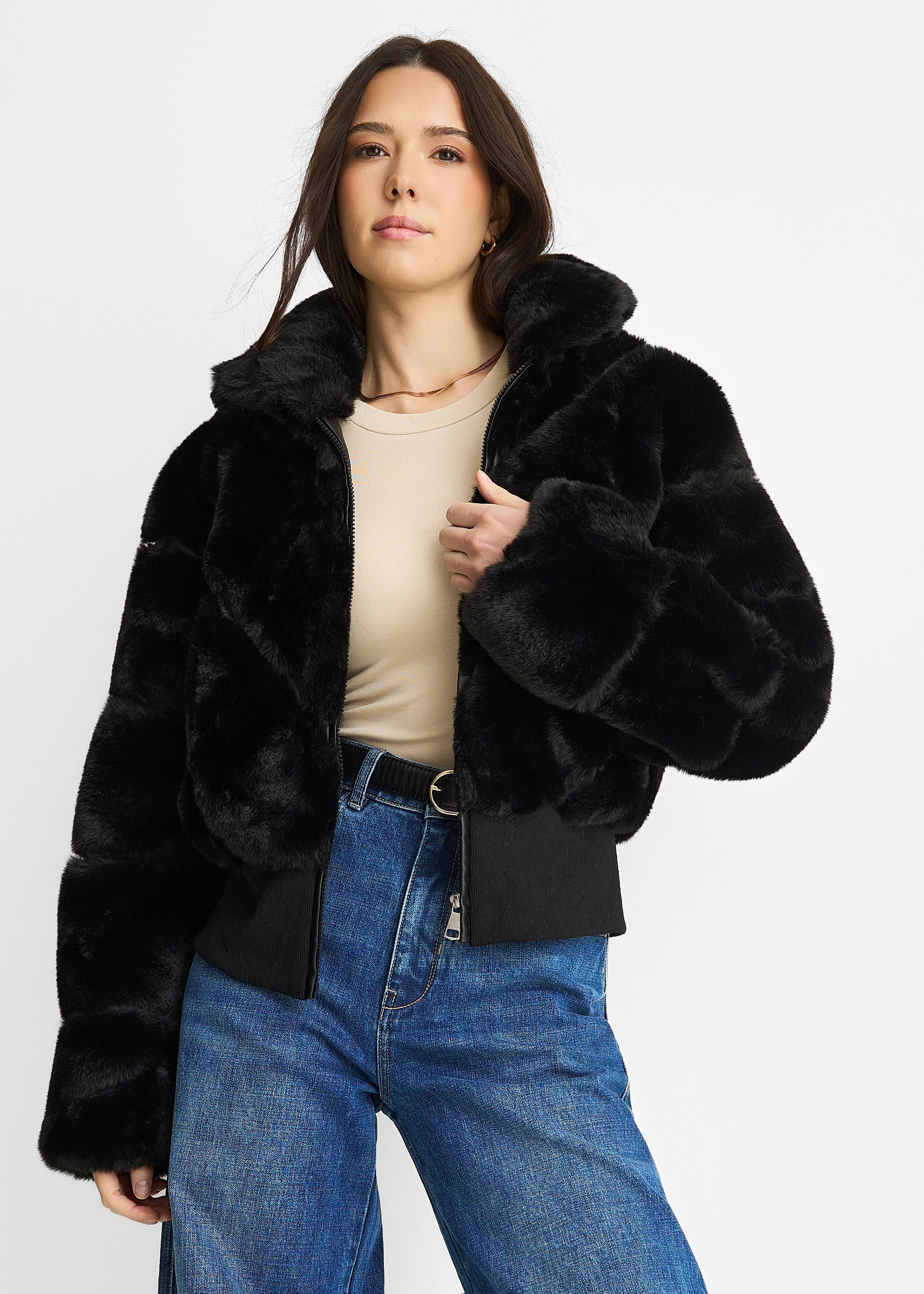 Stay warm and stylish in this black faux fur zip front short jacket. Its luxuriously soft fabric, full front zipper, and trendy silhouette are perfect for any winter look.