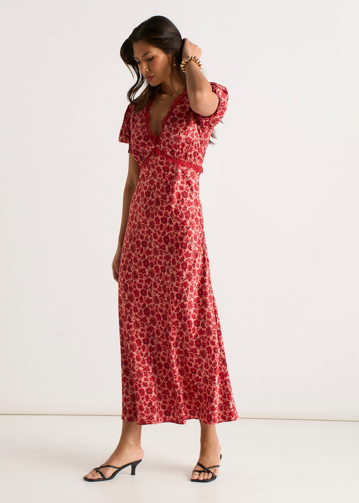 Red Floral Lace Trim V Neck Midi Dress