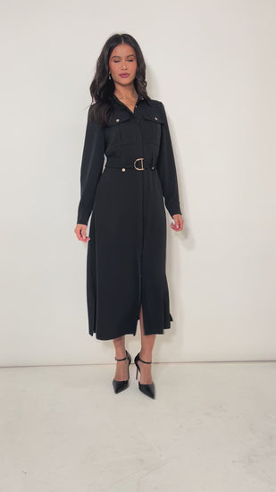 Black Luxe Gold Button Utility Shirt Dress