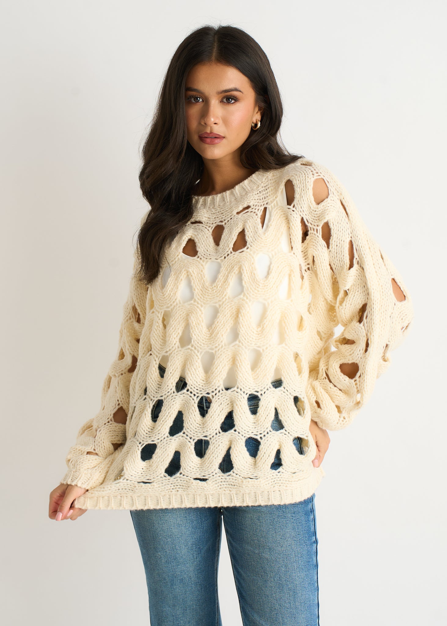 Make a statement in this butter cream hollow chunky knit jumper. The substantial cable texture creates visual drama while the airy hollow knit keeps it surprisingly lightweight—comfort meets bold design. The creamy butter tone brings warmth to any palette, pairing beautifully with neutrals, pastels, and jewel tones alike. The relaxed silhouette works solo or layers effortlessly under oversized coats for extra dimension. Perfect for those who believe knitwear should feel as good as it looks, this jumper delivers genuine comfort without compromise. Wear it with tailored trousers for elevated casual or pair with jeans for weekend ease. Bold in its texture, undeniably wearable.
