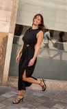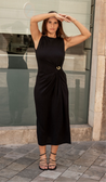 This sleeveless midi dress features a flattering ruched waist with a sleek metal trim, combining comfort with a bold, stylish edge. Its black fabric offers versatile wear for casual outings or confident evening looks, ensuring you feel both relaxed and striking wherever you go.