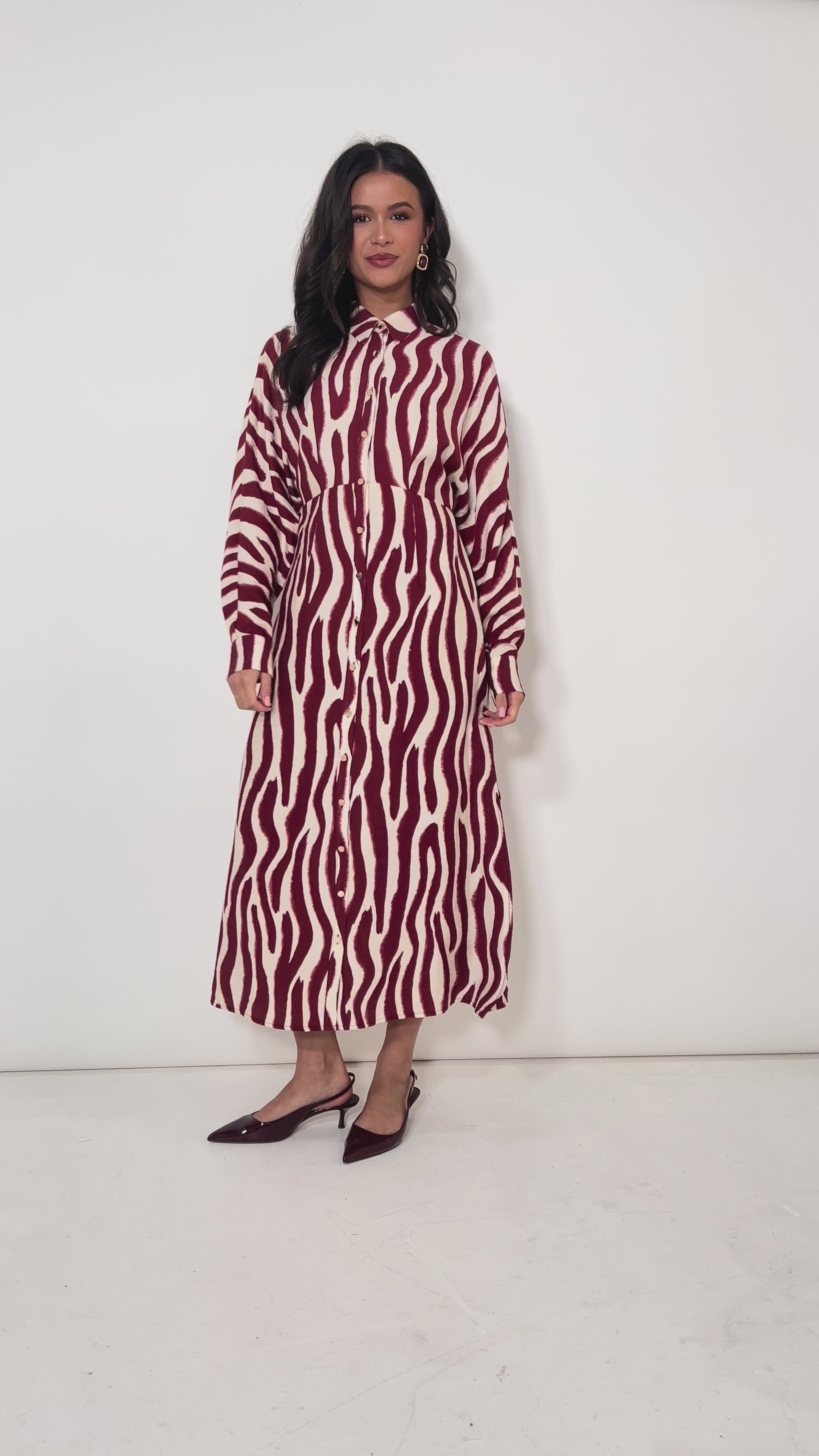 Make a statement with our Burgundy Zebra Print Shirt Dress, designed for those who embrace bold patterns and effortless style. The dramatic batwing sleeves add movement and dimension, creating a flattering silhouette that works equally well dressed up or down. Crafted for comfort, this piece transitions seamlessly from day to night, offering the relaxed ease of a shirt with the polished finish of a dress.