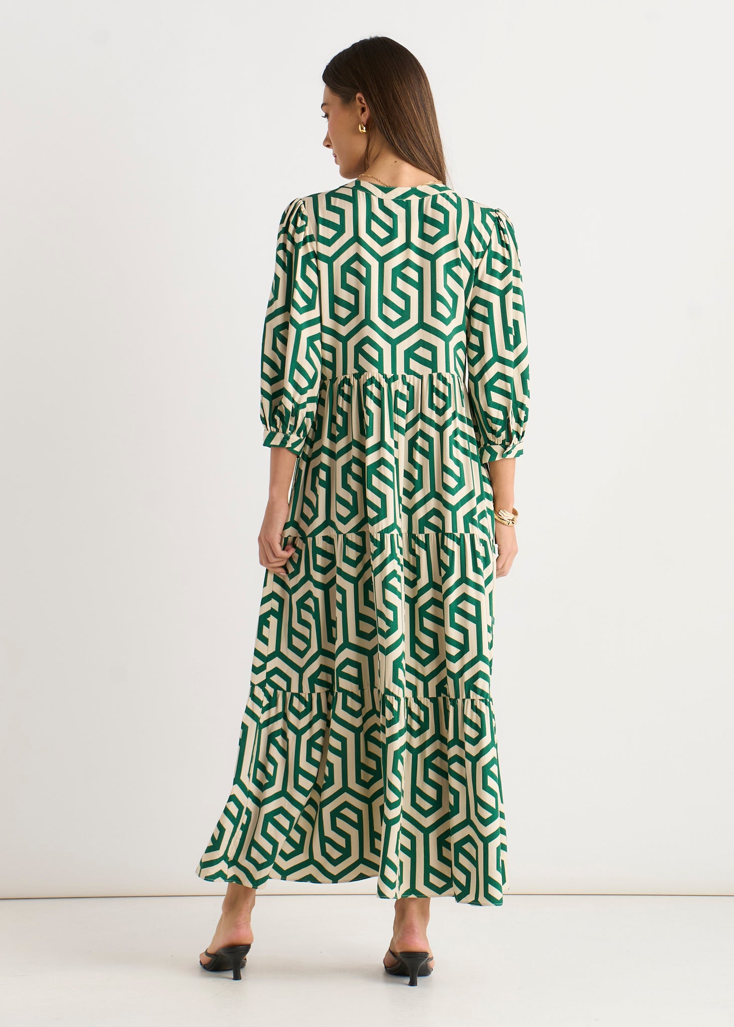 This Green Geo Print Smoke Maxi Dress brings together fashion and comfort. Made with a unique geo print pattern, this dress is perfect for any occasion. The smocked waist adds a flattering touch, while the flowy silhouette provides a chic and effortless style. Elevate your wardrobe with this must-have dress.