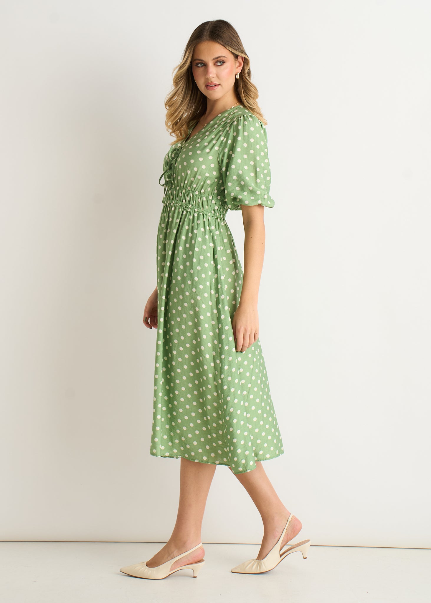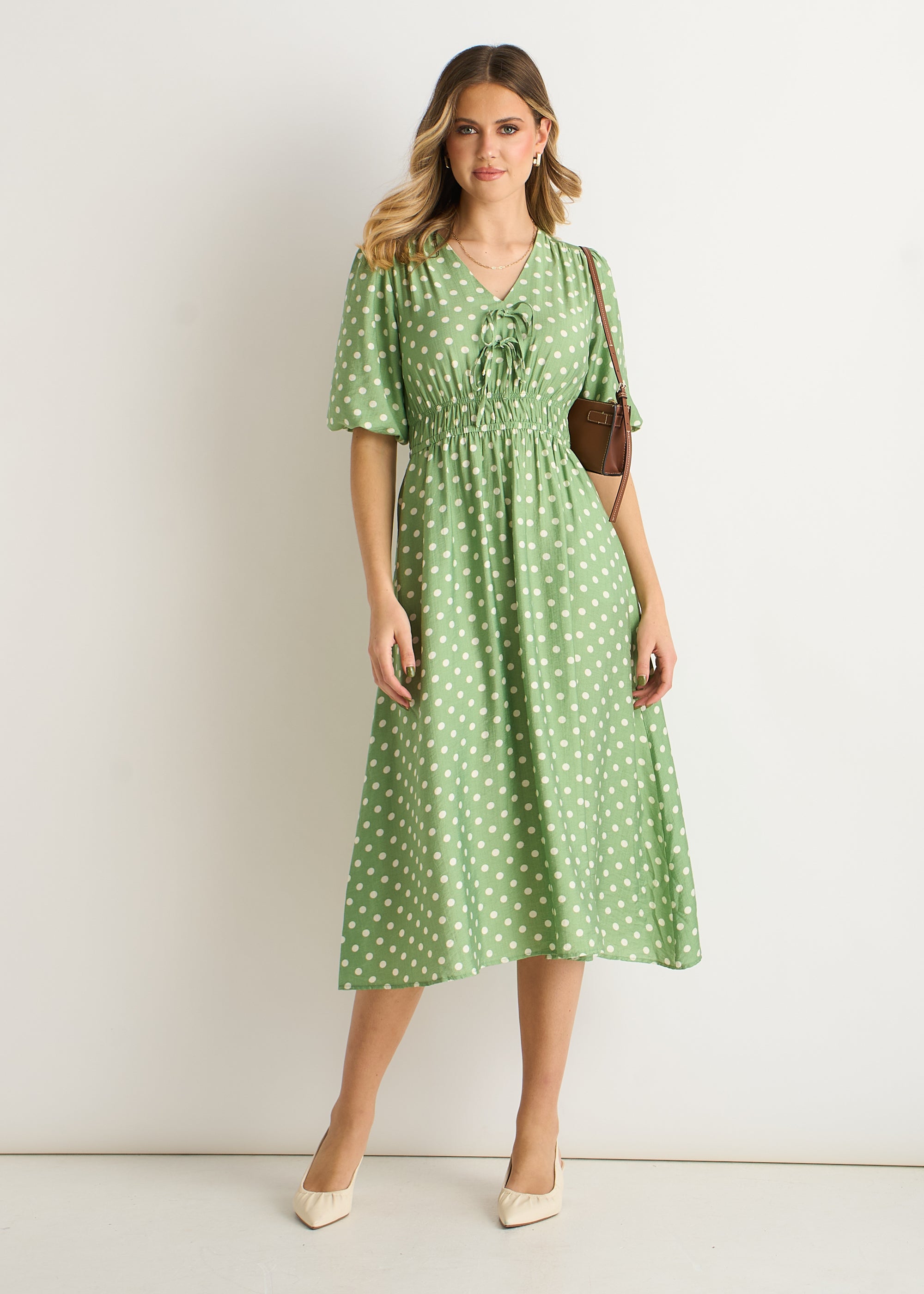 Sage Green Spot Print Shirred Waist Shift Midi Dress