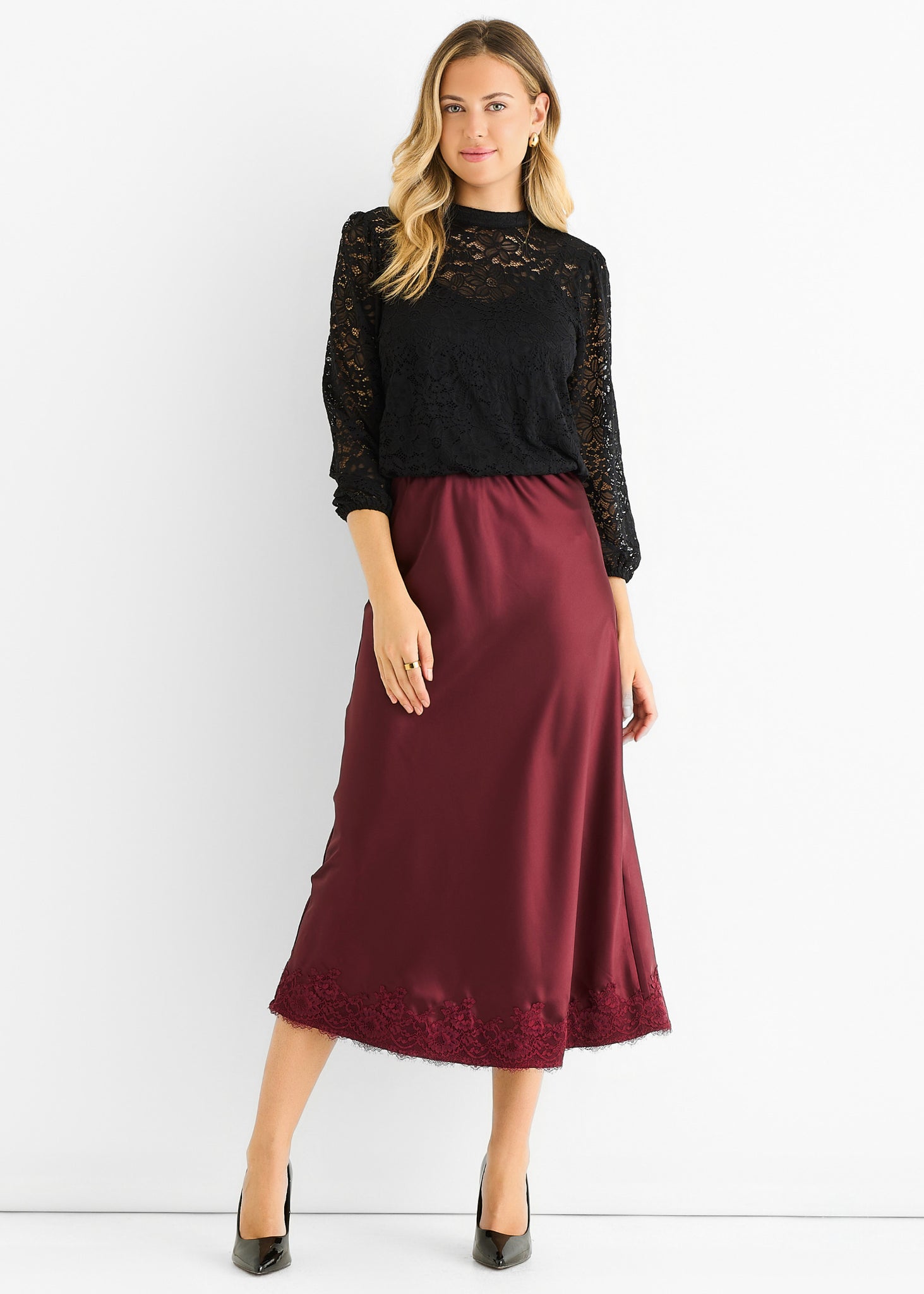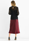 This black high neck blouse blends soft jersey fabric with intricate lace accents, offering a comfortable loose fit that moves with you. Its bold design adds a touch of elegance to casual wear, making it an effortlessly stylish choice for any occasion.