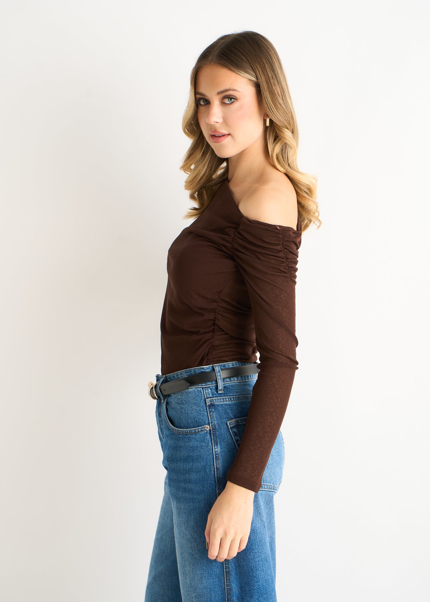 Elevate your everyday with this chocolate jersey top that refuses to blend in. The dramatic slash neckline creates an instant focal point while long sleeves in soft, forgiving fabric ensure all-day comfort. It's the rare piece that feels both daring and approachable—bold in design yet easy to wear with everything from denim to tailored trousers.