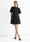 This black mini dress blends bold style with comfort. Featuring stretchy fabric and playful puff ball sleeves, it moves with you for an easy, relaxed fit. The sparkling diamante trim adds a touch of glamour, making it perfect for casual outings or statement nights.