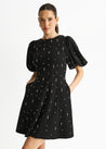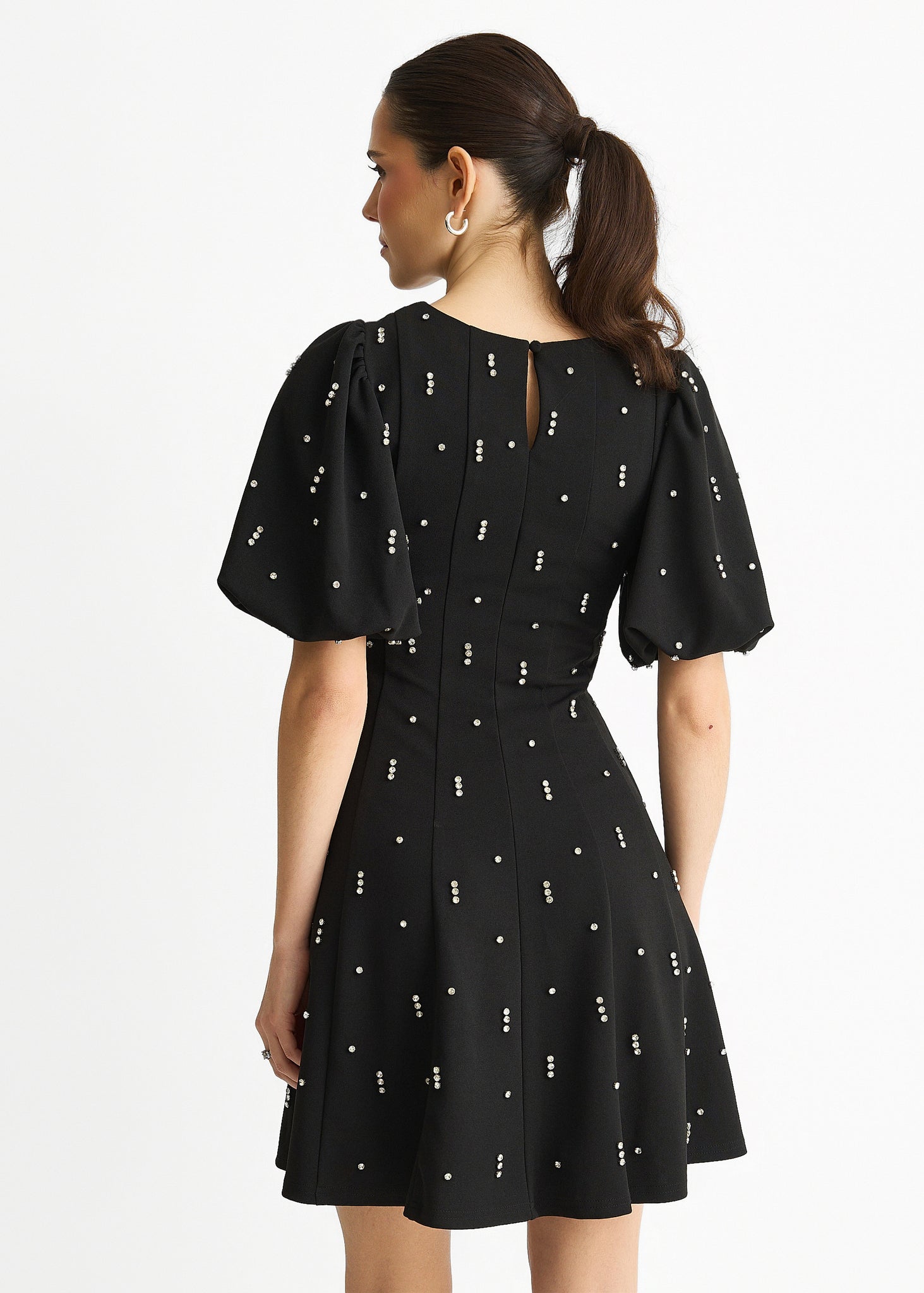 Black Diamante Trim Puff Ball Sleeves Stretchy Mini Dress