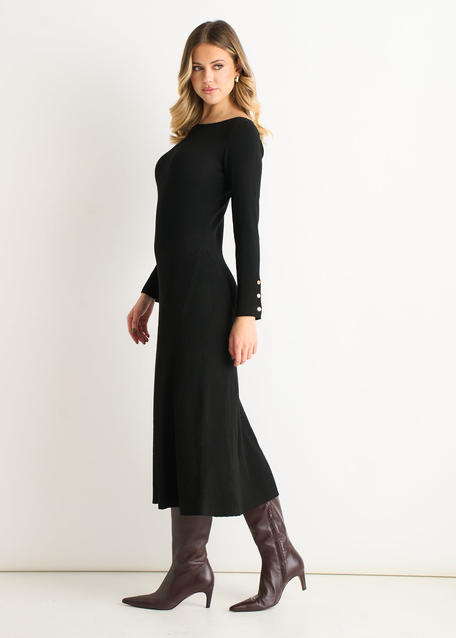 Effortlessly chic and undeniably flattering, this black knitted dress combines a daring slash neckline with a fitted bodice that flows into a graceful flared skirt. Crafted from soft, breathable knit fabric, it moves with you throughout the day while the flowing silhouette flatters every frame. Perfect for transitioning from office to evening—dress it up with heels and jewellery or keep it relaxed with trainers and a leather jacket.
