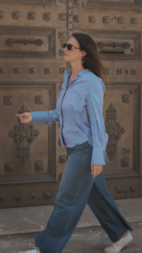 Blue Bow Embroidered Extreme Cuff Stripe Shirt