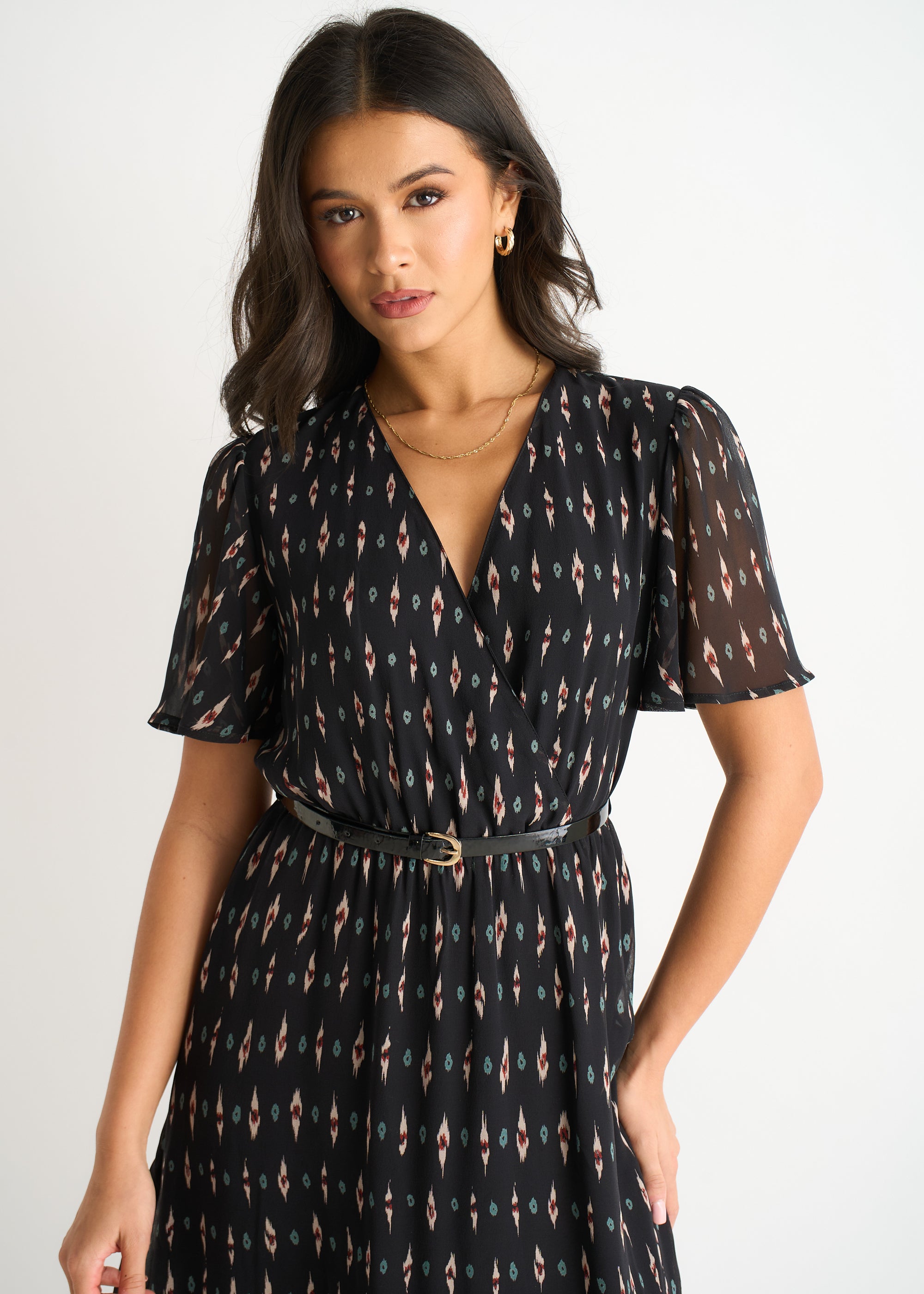 Effortlessly chic and undeniably versatile, this black midi dress combines geometric print intrigue with timeless elegance. The wrap front creates a flattering silhouette that skims your curves, while the fit-and-flare cut offers movement and comfort for all-day wear. Crafted from luxurious silk, it drapes beautifully and feels as good as it looks. Perfect for transitioning from office to evening—dress it up with heels or down with trainers for instant polish.