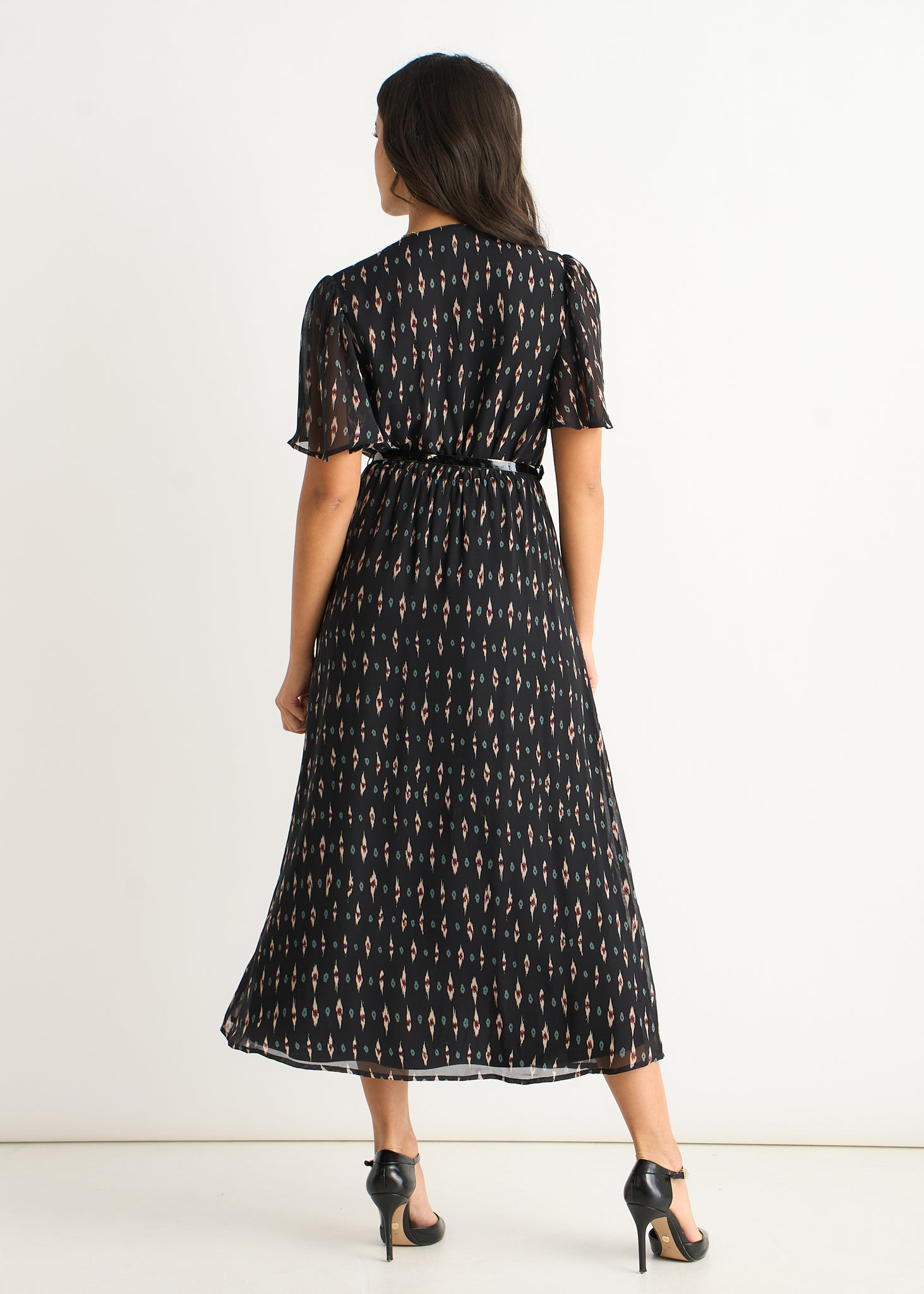 Black Geo Wrap Front Silk Fit & Flare Midi Dress